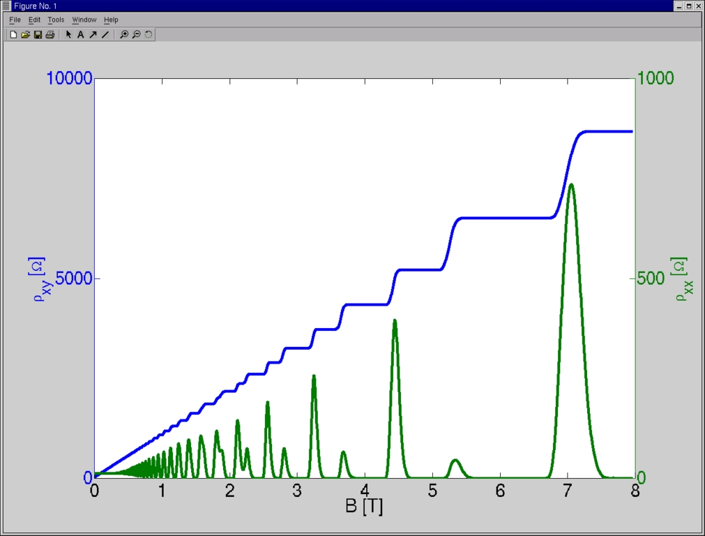 图 2 显示了 GaAlAs 异质结构的二维电子气中的霍尔测量轨迹。该图是从如图 3 所示的命令获得的。