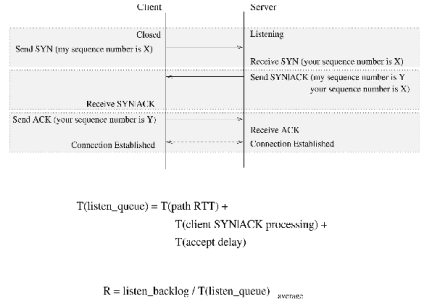 影响接受新连接速率的持续时间是在挂起的传入连接队列上花费的时间。 此持续时间等于 SYN|ACK 消息及其 ACK 响应的往返时间,加上客户端处理 SYN|ACK 消息所花费的时间,再加上服务器处理 ACK 和调用 accept() 的延迟。